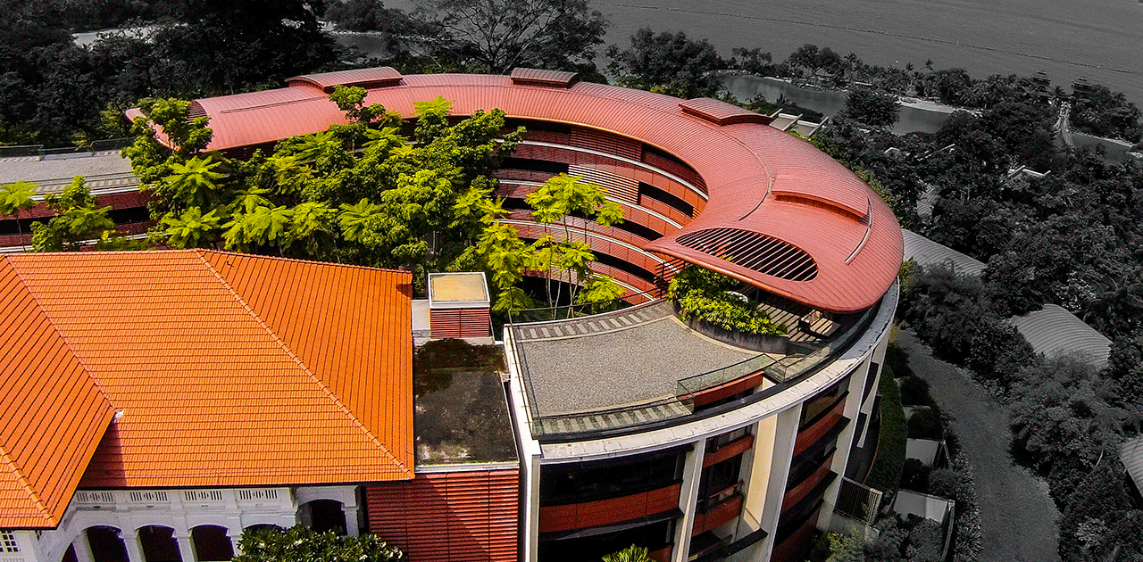 Setting the standard for luxury accommodation in Singapore, the 5-star Capella Hotel comprises curved, striking structures which intermingle with colonial buildings. The clever blend of old and new makes the Capella Singapore a masterpiece. Its boomerang-shaped roof makes a bold statement, constructed from aluminum but conveying classy copper finish, accompanied by 36 rustic copper-roof villas.